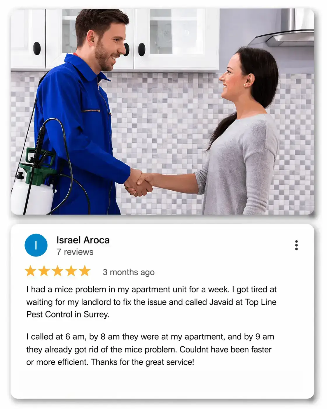 EXCELLENT Based on 33 reviews Posted on Google Israel ArocaTrustindex verifies that the original source of the review is Google. I had a mice problem in my apartment unit for a week. I got tired at waiting for my landlord to fix the issue and called Javaid at Top Line Pest Control in Surrey. I called at 6 am, by 8 am they were at my apartment, and by 9 am they already got rid of the mice problem. Couldnt have been faster or more efficient. Thanks for the workPosted on Google deem nutzTrustindex verifies that the original source of the review is Google. Come on short notice to take care of ants in the kitchen. Excellent service and communication. He even took time to spray the drivewayPosted on Google Raman harryTrustindex verifies that the original source of the review is Google. Best ever servicePosted on Google sam sethiTrustindex verifies that the original source of the review is Google. I have used their services for the past 3 years in a row. Fast and prompt service provided by the Owner always, positive results achieved and a very understanding attitude towards the clients expectations. Highly recommend Mr. Javeid for Pest Control services.Posted on Google Abdullah MumtazTrustindex verifies that the original source of the review is Google. Very professional and did a great job!Posted on Google Sadik TumaTrustindex verifies that the original source of the review is Google. Very professional work!!! We had a rat problem the first time at our store and he came and cleared it all within a week however we had another problem with cockroach's and with great work he is treating it right now. Price is really good and a very good man explains everything to you and does check ups.Posted on Google Miya AhmadTrustindex verifies that the original source of the review is Google. We had cockroaches in our house and we contacted Top Line Pest Control to help get rid of them. Javad came to our house to do an inspection in which he took great care and time to look around and understand the problem. He then did the treatment to exterminate the bugs and it worked! Service was great, price was reasonable, and I highly recommend for pest services!Posted on Google Sudheer CharyTrustindex verifies that the original source of the review is Google. Javed is very good and experienced in pest control. For both mice and bed bugs we had many issues, he visited home and provided prompt solutions. We no longer have issues. We highly recommend their service.